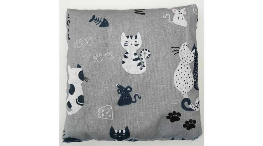 Műanyag granulátummal töltött iskolai, óvodai babzsák. Szürke cica mintás.