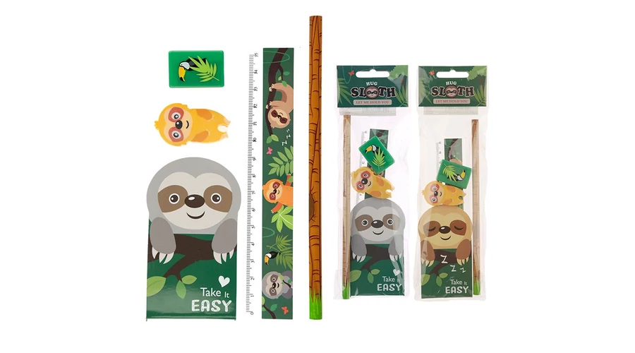 Lajháros iskolai írószer készlet, melynek tartalma: 1 db grafitceruzát, 1 db 15 cm-es egyenes vonalzót, 1 db lajhár figura radírt és 1 db hegyezőt. Két különböző mintájú jegyzetfüzettel kapható a suliszett.