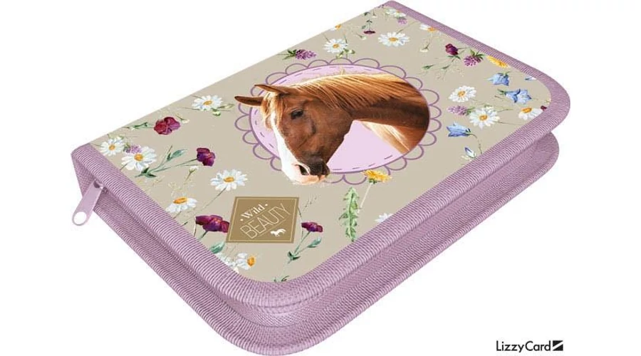 Cipzárral zárható, két oldalán kihajthatós klapnival rendelkezik. A tolltartó széle varrott, külseje fényes karton. A kihajthatós füleken ceruzáknak és órarendnek is van helye. A lovas tolltartó belsejében is gumipántok vannak ceruzáknak, hegyezőnek, radírnak.