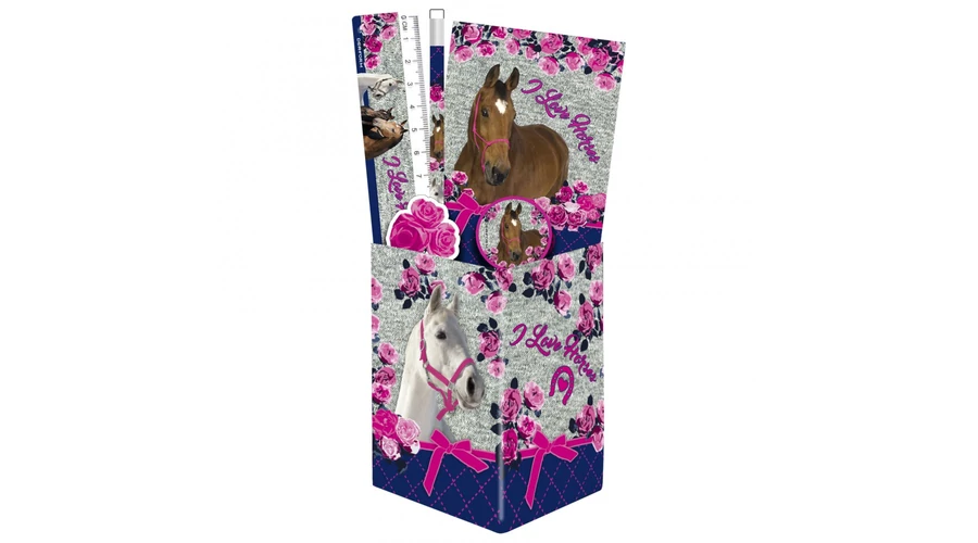Lovas karton, négyszögletes ceruzatartó, benne lovas írószerek.